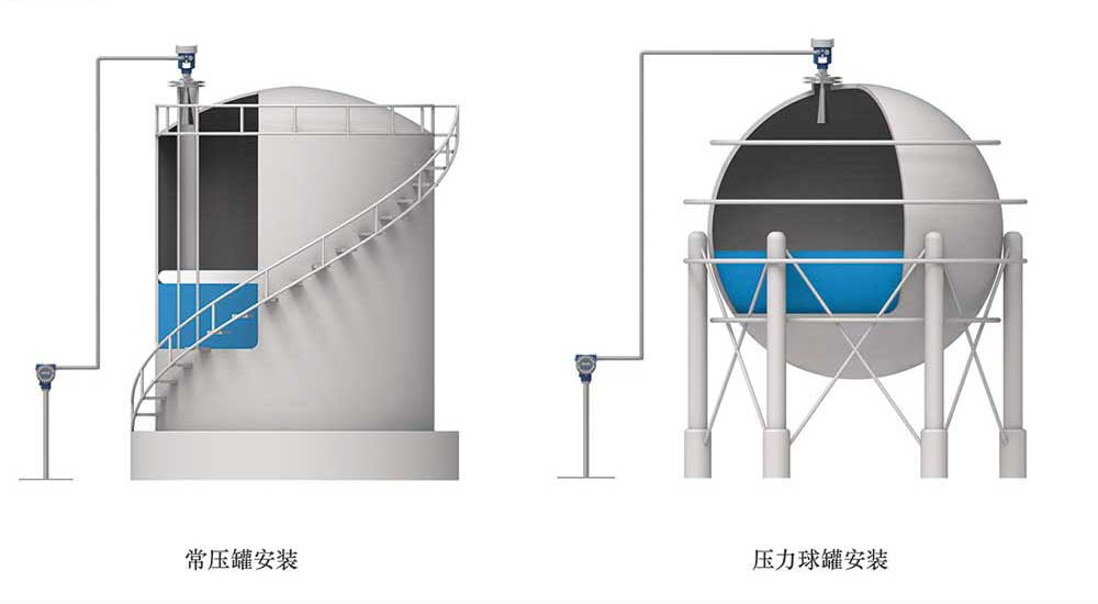 安裝要求:一般采用標準法蘭安裝到罐頂,也可采用旁通管安裝,導波管安裝等多種方式。高頻雷達放置在罐體直徑的1/4或1/6處,距罐壁不小于200mm,26G天線伸入到罐里至少10mm;測量錐形罐體,應安裝在錐形罐體平面的中間,保證可以測量到錐形頂部;測量有堆料的罐體,法蘭選型應選擇萬向法蘭(可調節方向)。